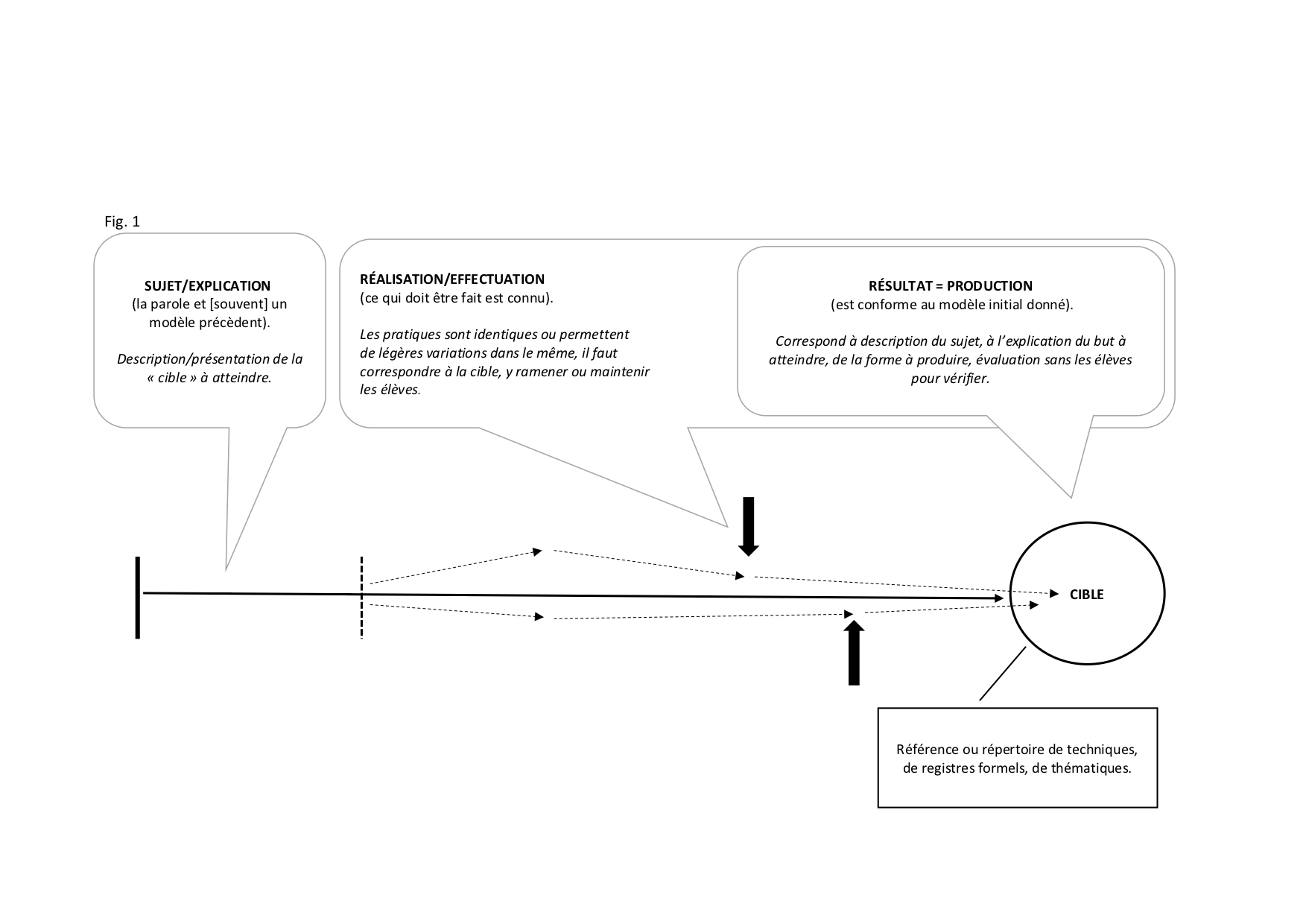 Les programmes de 1996-98 avaient confirmé une importante rénovation pédagogique et didactique, amorcée plus de quinze années auparavant. Deux schémas sommaires, commentés par mes soins (source : d’après Gilbert Pélissier, Igen alors en charge des arts plastiques) représentent quelques changements significatifs de paradigmes et des transformations alors à l’œuvre, tant sous l’angle de la conduite des apprentissages que de l’évaluation. On a pu parler à l’époque d’un passage du cours dit « traditionnel » (fig. 1) à l’enseignement dit « en proposition » (fig. 2).